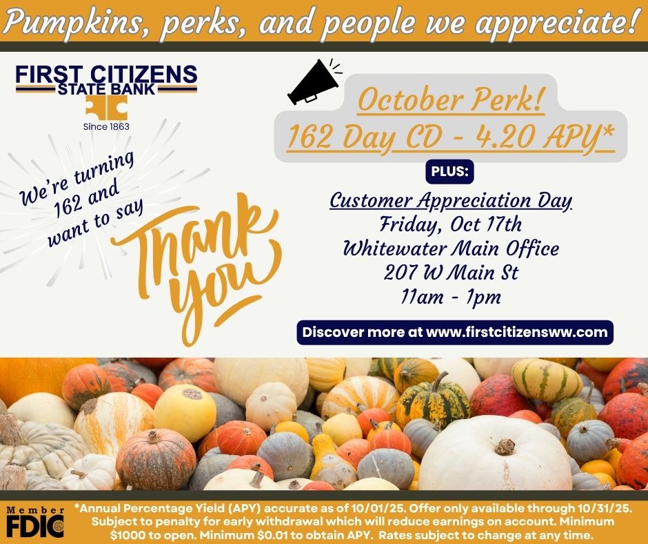 AND - We'll be celebrating Customer Appreciation Day at the Whitewater Main office on Friday, October 17th along with Shred Day! Enjoy lunch, dessert, games, and giveaways from 11:00am to 1:00pm!