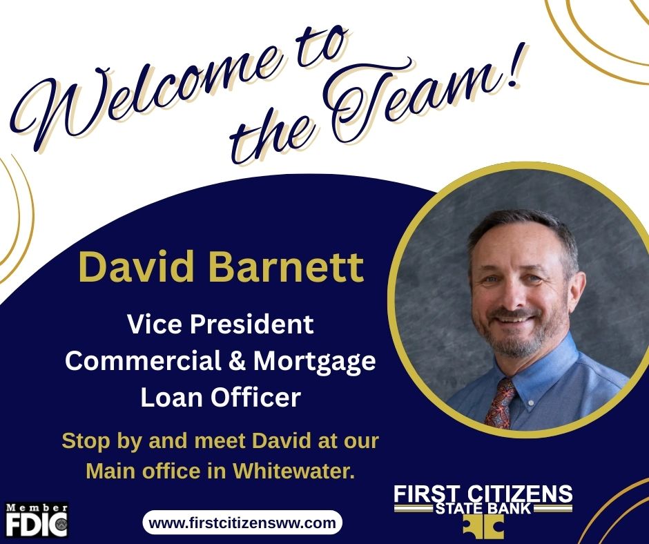 Whitewater, WI – Nate Parrish, President of First Citizens State Bank, is pleased to announce that David Barnett has joined the Bank as Vice President – Commercial & Mortgage Loan Officer at the Whitewater Main Office, located at 207 W Main Street, Whitewater, Wisconsin.