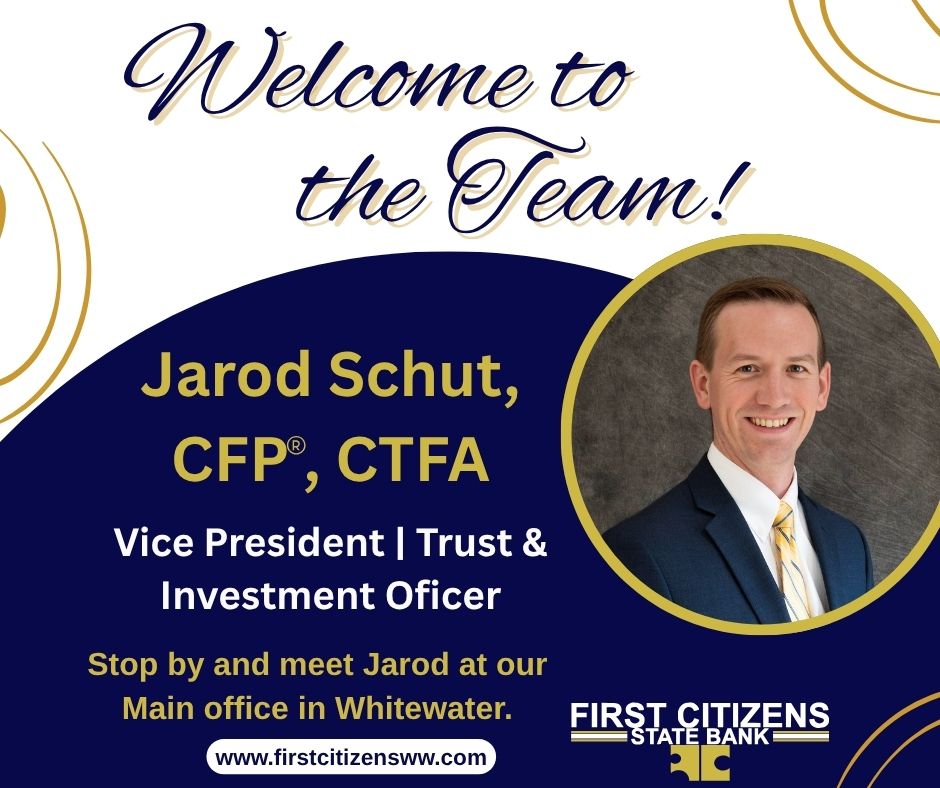 Whitewater, WI – Nate Parrish, President of First Citizens State Bank, is pleased to announce that Jarod Schut, CFP®, CTFA has joined the Bank as Vice President – Trust & Investment officer at the Whitewater Main Office, located at 207 W Main Street, Whitewater, Wisconsin.