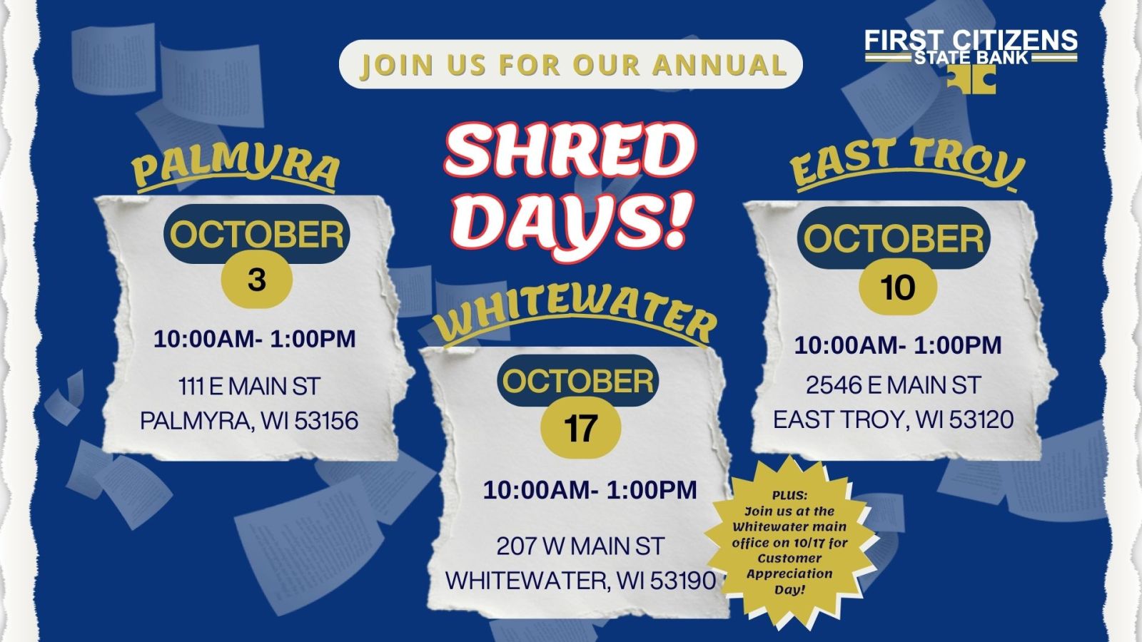 AND - We'll be celebrating Customer Appreciation Day at the Whitewater Main office on Friday, October 17th along with Shred Day! Enjoy lunch, dessert, games, and giveaways from 11:00am to 1:00pm!